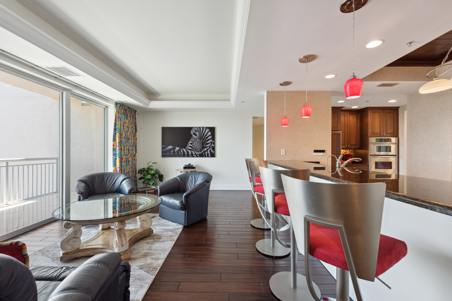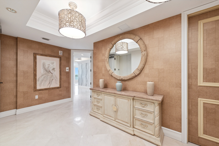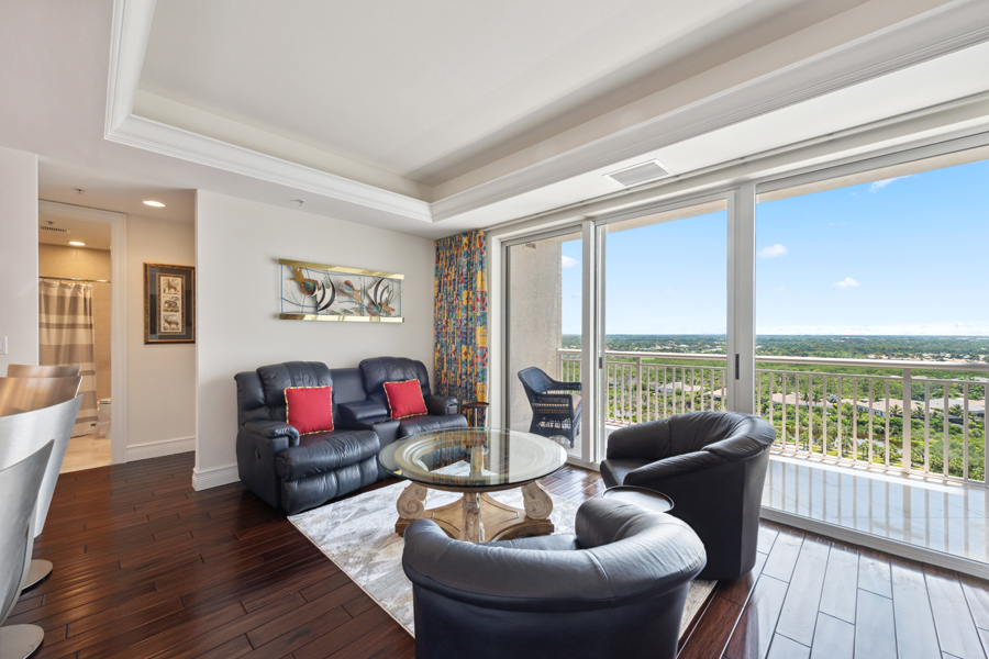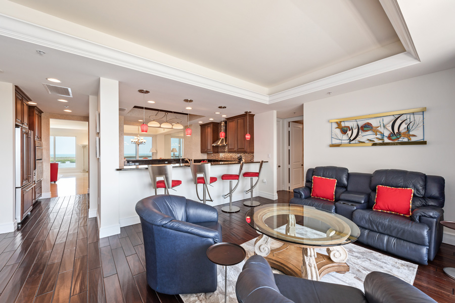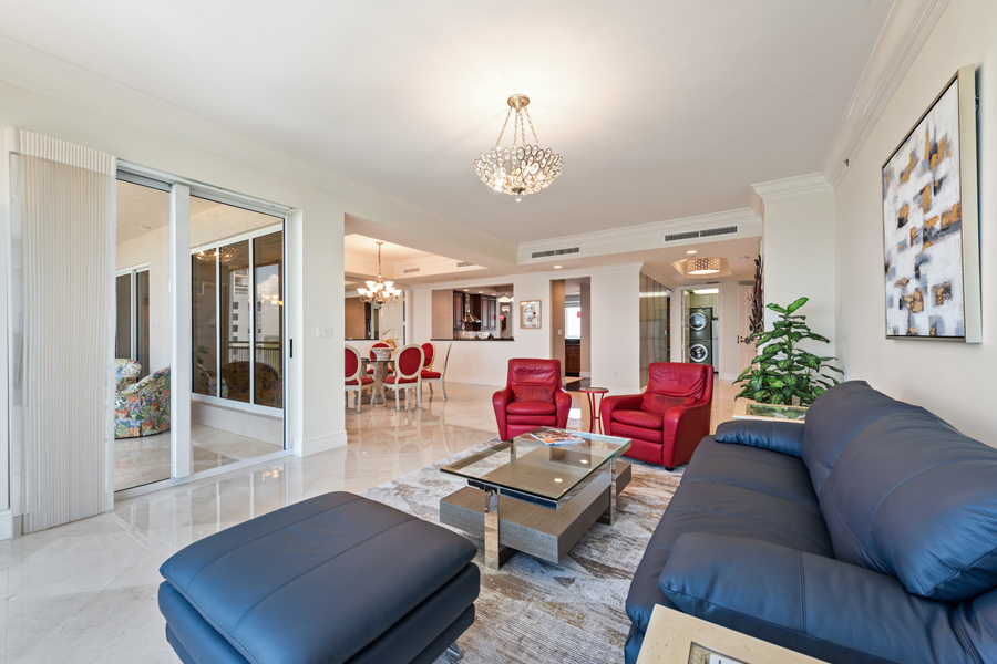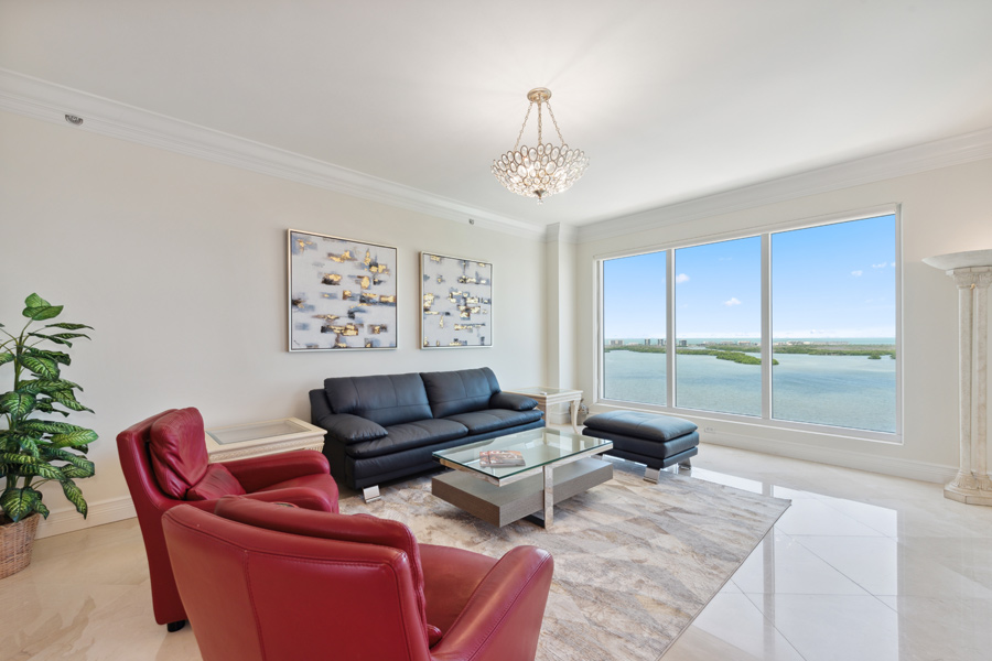 A special opportunity: This rarely available higher floor unit–on the 17th floor, with the very desirable “02” floor plan. 3 Bedroom/3 Full Baths with 2,730 square feet under air. This newly refreshed unit features open and panoramic views from all the main living areas. Your own private screened lanai with views to the West to enjoy ever-changing sunsets. An open balcony to the East to enjoy your morning coffee. A VALUABLE ADDED BONUS: A PRIVATE 2-CAR GARAGE, close to elevator lobby, is INCLUDED in the sale. Tasteful upgrades include new leather living room furniture and new chandeliers in all 3 bedrooms and living room. Brand new carpet in Master and Guest Bedroom. New Samsung Frame QLED 75″ TV will entertain you and your guests from day 1 of your ownership! Offered FURNISHED. Esperia now features a recently completed total renovation of its first and second-floor lobby areas.