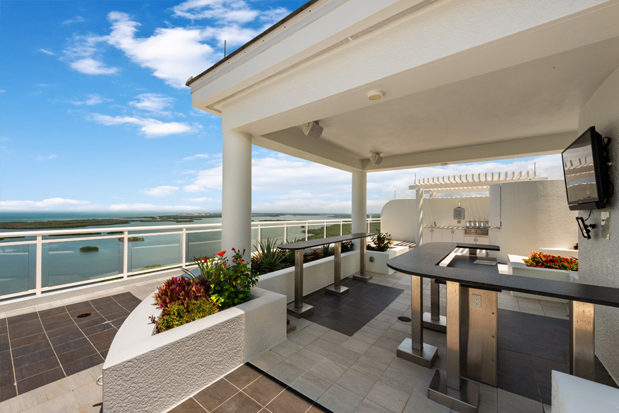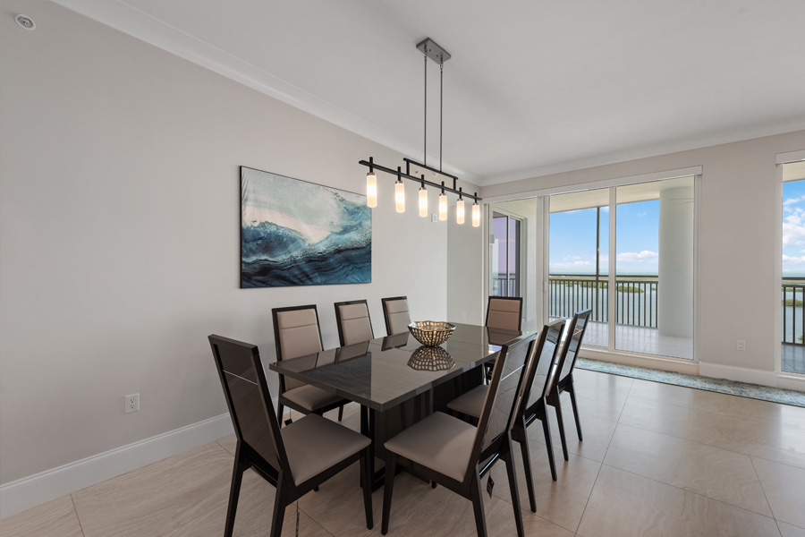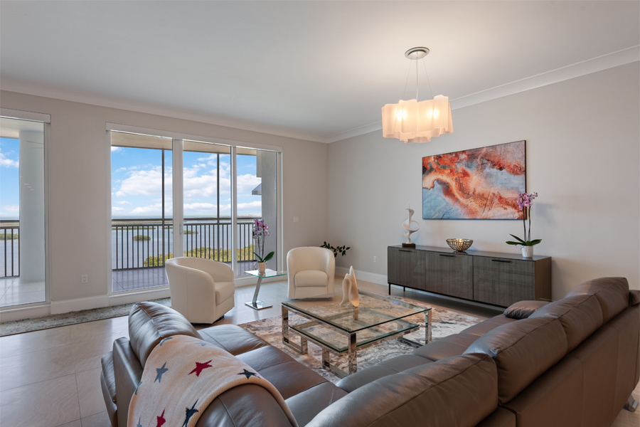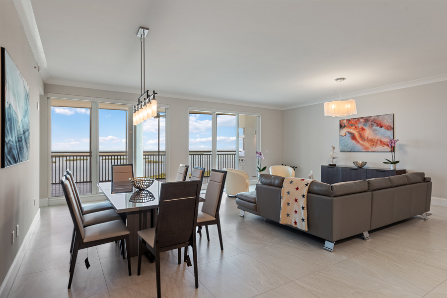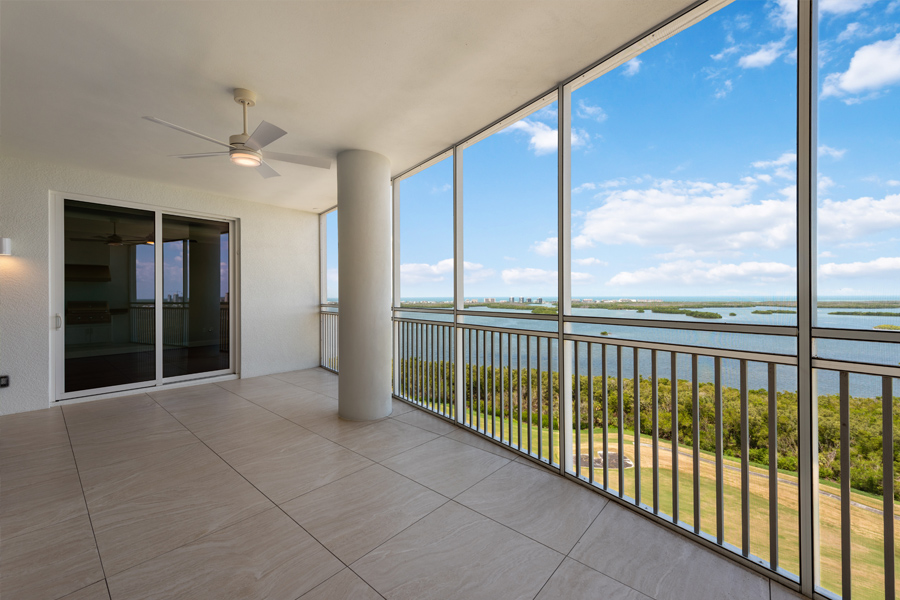 Stunning panoramic views of the Estero Bay, the Gulf of Mexico and beyond from this 17th floor home at Seaglass in Bonita Bay. Private elevator foyer and double door entry. 3 BR plus den and 3 1/2 baths. NOW OFFERED FURNISHED–WITH BRAND NEW DESIGNER LIVING ROOMAND DINING ROOM FURNITURE. Open floor plan with 3,088 square feet under air, plus a private screened lanai with barbecue grill. Additional open balcony located on the east side. Top-of-the-line Thermador gas-cooking appliances. Large screened lanai with built-in gas grill is perfect for entertaining. Wood floors in the bedrooms and den. Building amenity package includes resort-style pool, billiard and event rooms, fitness center, private movie theater, guest suites, and his/her spa and massage rooms. Direct elevator access from the unit to the roof top terrace with bar area and grills, with broad views of the Gulf of Mexico. Optional Bonita Bay Club provides world-class golf (5 courses designed by Arthur Hills and Tom Fazio), tennis, pickle ball, clubhouse/dining and 60,000 square foot Lifestyle/Fitness Center.