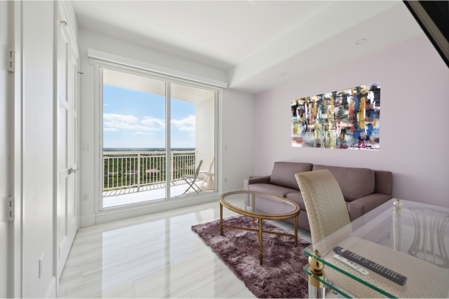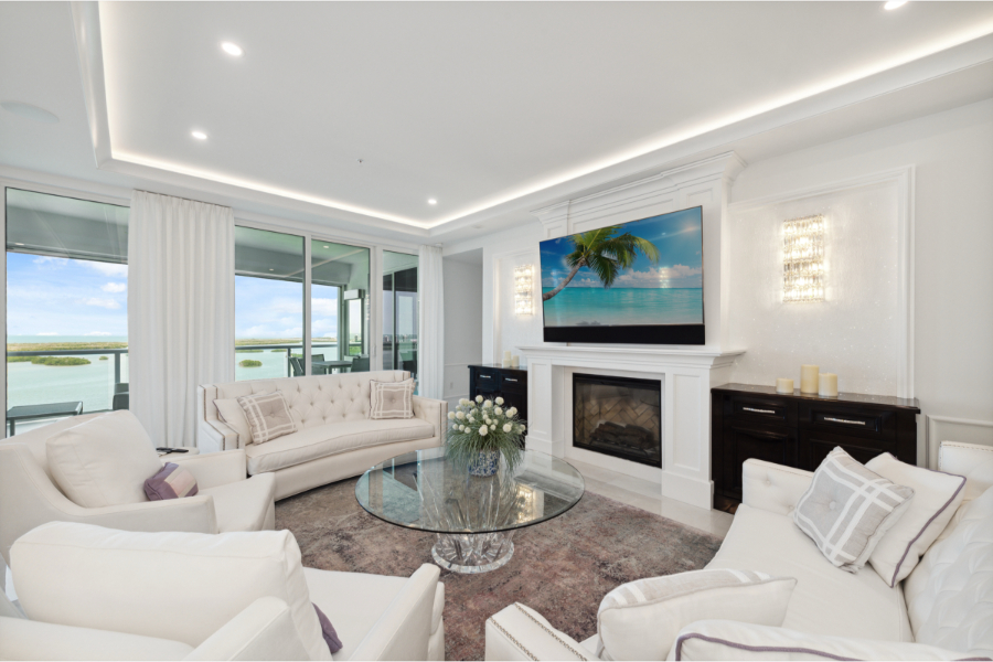 This is a very special residence on the 18th floor of Seaglass, with many high-end designer finishes and furnishings. 3 Bedrooms plus Den/Office with 3 1/2 baths. Dramatic sunset views over the Estero Bay and the Gulf. Open balcony to the West with electric hurricane shutters with screen and shades. Open balcony to the East. Lovely formal living room with electric fireplace. Crystal Quartzite countertops. Kinetico whole-unit water system. SONOS sound system throughout. Please make sure that you see the photos! Private elevator foyer. Spacious primary bedroom with large bath/tub and 2 walk-in closets. 2 additional guest bedrooms, each with private bath. Den/Office with 2 reclining chairs for your enjoyment. Gourmet kitchen with induction cooktop. Sold completely and beautifully furnished. This unit includes 2 assigned under-building parking spaces on the second floor level and a climate-controlled storage unit. Amenities include a resort-style pool, spa, fitness room, billiards room, card room and large social room. 3 guest suites on the second floor of Seaglass and rooftop terrace for use by you and your special guests or family members. Start living your dream Florida lifestyle today!
